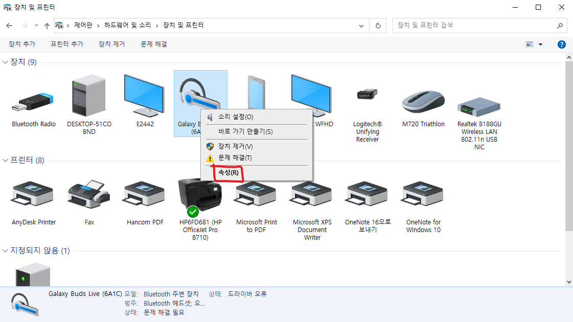 2. 자신의 블루투스 이어폰 우클릭 -> [속성]