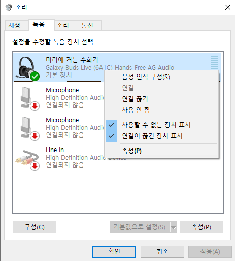 블루투스 이어폰은 마이크를 쓸 수있지만 저는 PC에서 쓸일이 딱히 없어서 소리 창 -> 녹음에서 마이크를 사용안함으로 바꿉니다.